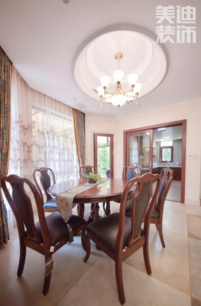 圓形餐桌滿足全家人其樂融融的就餐環(huán)境,地面增加拼花造型,以增加大氣和空間層次。