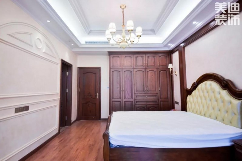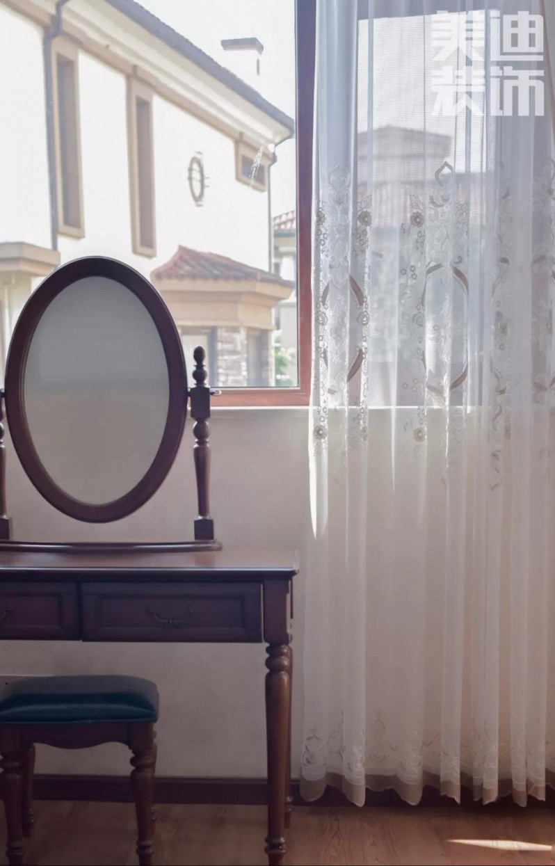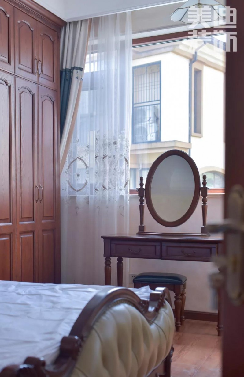 二層的次臥與主臥的搭配基本一致,具有美式特色梳妝臺,為空間點綴上幾分典雅與精致。