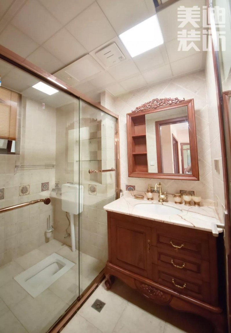 衛(wèi)生間沿用了客廳風格,大理石洗漱臺面、實木浴柜與黃銅擺件格調交相呼應,滿足主人對浪漫的追求。