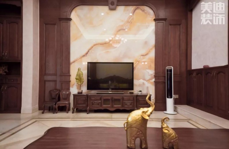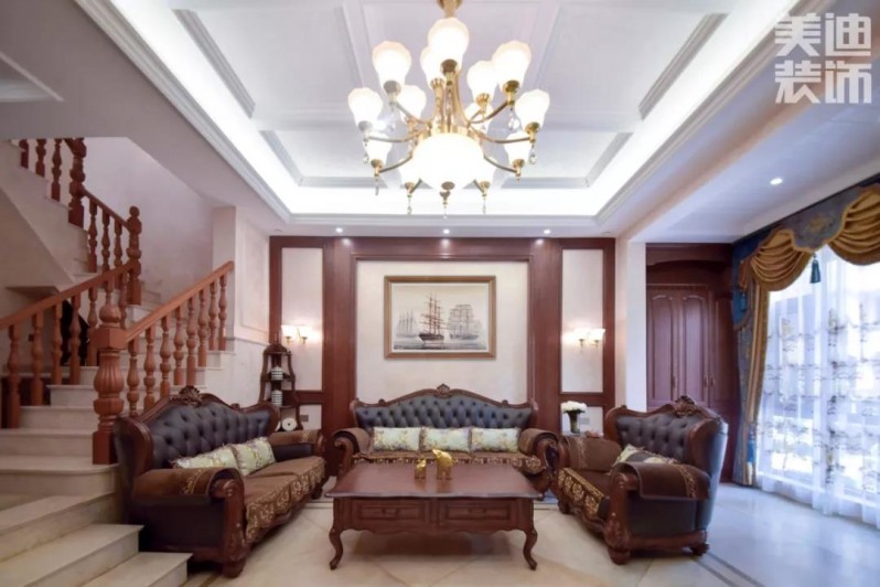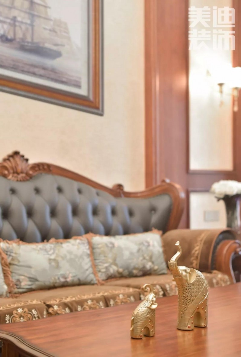 美式設計常運用大量的石材與實木裝飾,在擺件和裝飾上呈現(xiàn)仿古質感,體現(xiàn)寬敞且富有歷史氣息的氛圍。