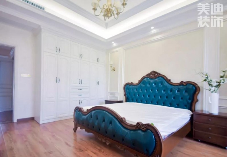 三層主臥是業(yè)主夫婦為兒子準備的婚房,整體色調更輕快明朗,床品依舊采用實木色,藍色的點綴顯得整個空間更靈動。