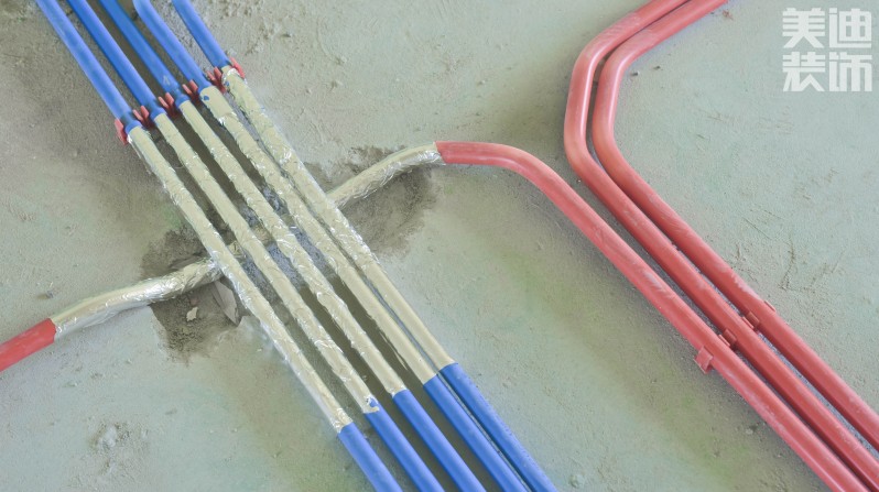 藍色為弱電,紅色為強電。強弱電間距均在30公分以上,這可避免并排走線強電和弱電之間的干擾。