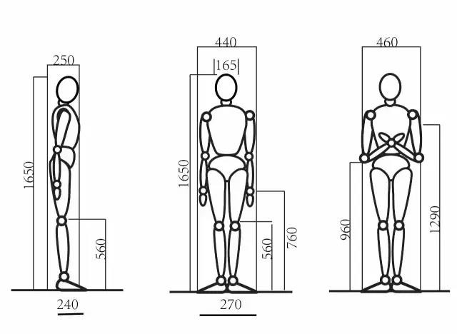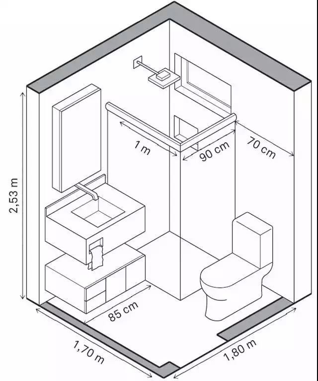 馬桶所占的一般面積:37厘米×60厘米。懸掛式或圓柱式盥洗池可能占用的面積:70厘米×60厘米。正方形淋浴間的面積:80厘米×80厘米。浴缸的標準面積:160厘米×70厘米。