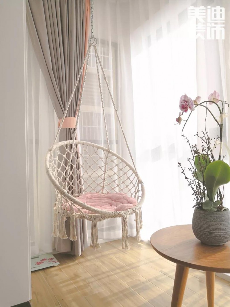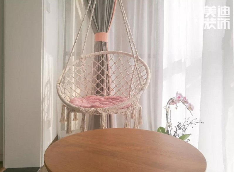 一邊是吊椅,一邊則放置著小書桌,一縷陽光灑下來,真是好不愜意啊!