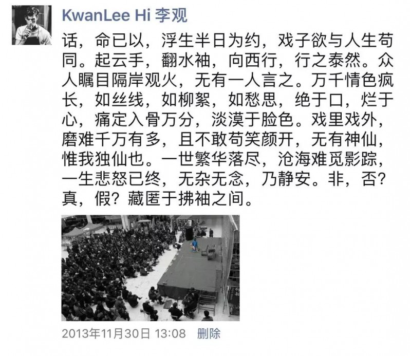 “有一天在朋友圈看了這張黑白圖片,只有臺上的戲子穿著戲服是彩色,頓時感覺臺上的戲子也許和我當(dāng)時的心境是一樣的:戲子的人生有兩種,臺上扮演的是一種,臺下的自己的是一種。