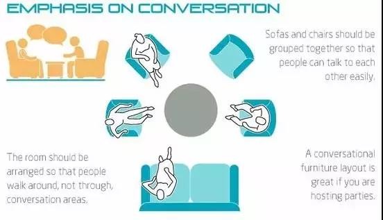 比如最長的一面墻可以成為焦點物件,沙發(fā)、座椅的朝向都轉向焦點物件形成一個弧形的對話空間。