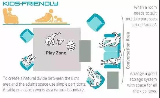 如果家中有小孩的話,可以在客廳設計一個專門供孩子們玩耍的地方,用沙發(fā)或者桌子將孩子的游戲區(qū)與大人的休息區(qū)分開。