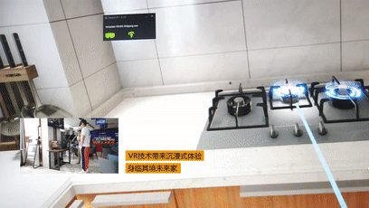 借助VR眼鏡,設(shè)計(jì)的元素和細(xì)節(jié)都體現(xiàn)的清清楚楚,還可以自動(dòng)打開(kāi)水龍頭、燃?xì)庠睿瑤?lái)身臨其境未來(lái)家的感覺(jué)。