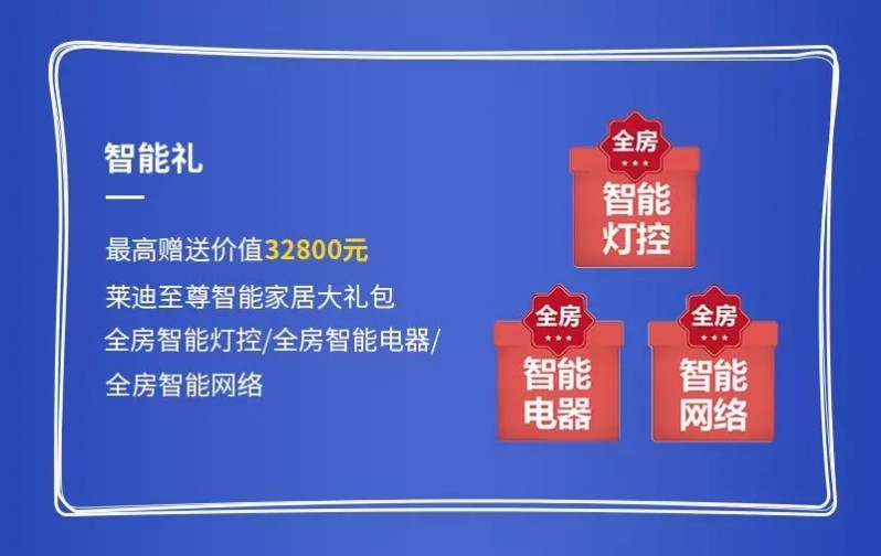 全房全景智能家裝年中大促,體驗(yàn)未來(lái)家,省心更省錢(qián),全房智能家裝一次配齊,贈(zèng)送價(jià)值32800元智能家居大禮(智能家居大禮包三選一)。