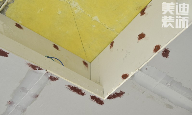 在現(xiàn)場(chǎng)和木工師傅了解到,在天花工藝中,最容易開裂的部分當(dāng)屬轉(zhuǎn)角處。為了防止吊頂轉(zhuǎn)角開裂,木工師傅會(huì)采用“7”字轉(zhuǎn)角工藝,木制天花與梁位底部平接時(shí),將梁底部位板條打底,再用夾板包住梁體下口,防止開裂。