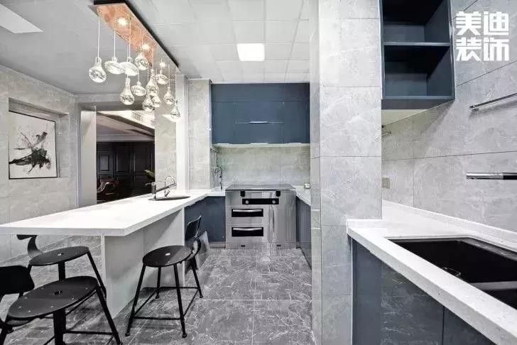 對(duì)于小戶型來(lái)說(shuō),最重要的就是視覺上的空間延伸,那么不妨考慮做成開放式廚房,這不僅省去了隔斷空間,也節(jié)約了一條動(dòng)線空間。