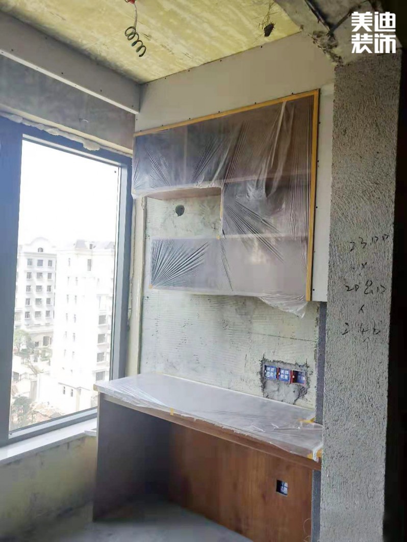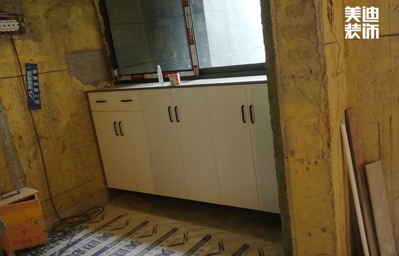現(xiàn)場制作鞋柜,結(jié)構(gòu)整齊,柜子表面平整、潔凈、色澤一致,無翹曲、裂縫及損壞。墻體整面密度板打底,現(xiàn)場制作懸挑餐邊柜及層板架,后期油漆飾面。