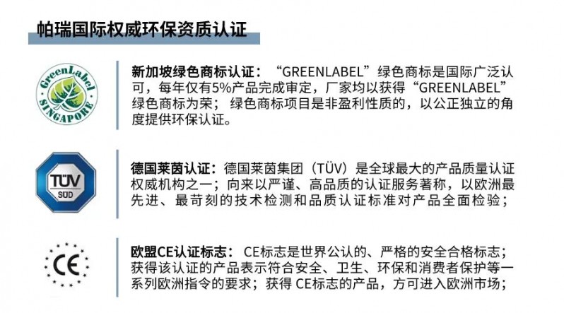 帕瑞涂料在VOC含量相關(guān)檢測(cè)中VOC含量趨0,重金屬物質(zhì)檢測(cè)中無(wú)汞、鉛等物質(zhì),符合國(guó)內(nèi)外各類(lèi)檢驗(yàn)標(biāo)準(zhǔn),并取得國(guó)際多項(xiàng)權(quán)威資質(zhì)認(rèn)證。