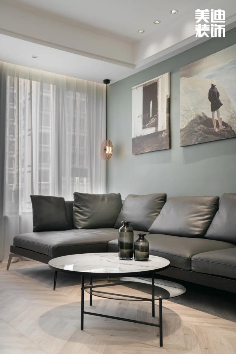 大理石茶幾簡(jiǎn)單時(shí)尚,灰綠色墻面色彩飽和度低,舒適居家。藝術(shù)感十足的裝飾畫(huà)給家里增添幾分文藝氣息,使得居家生活更有品位。