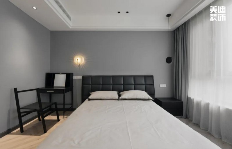 根據(jù)建筑形體設(shè)計(jì)黃色跟灰色的撞色對(duì)比,干凈整潔不失雅趣。滿頂設(shè)計(jì),見(jiàn)光不見(jiàn)燈,床頭藝術(shù)壁燈點(diǎn)點(diǎn)光源,黑色騎士床品和梳妝臺(tái)相互依偎色調(diào)和諧。雙層絨布面料搭配魚(yú)骨紗窗簾,遮光又不失通透感的白紗,硬朗中帶有溫柔感。
