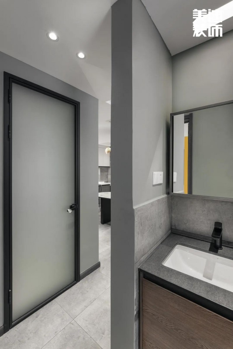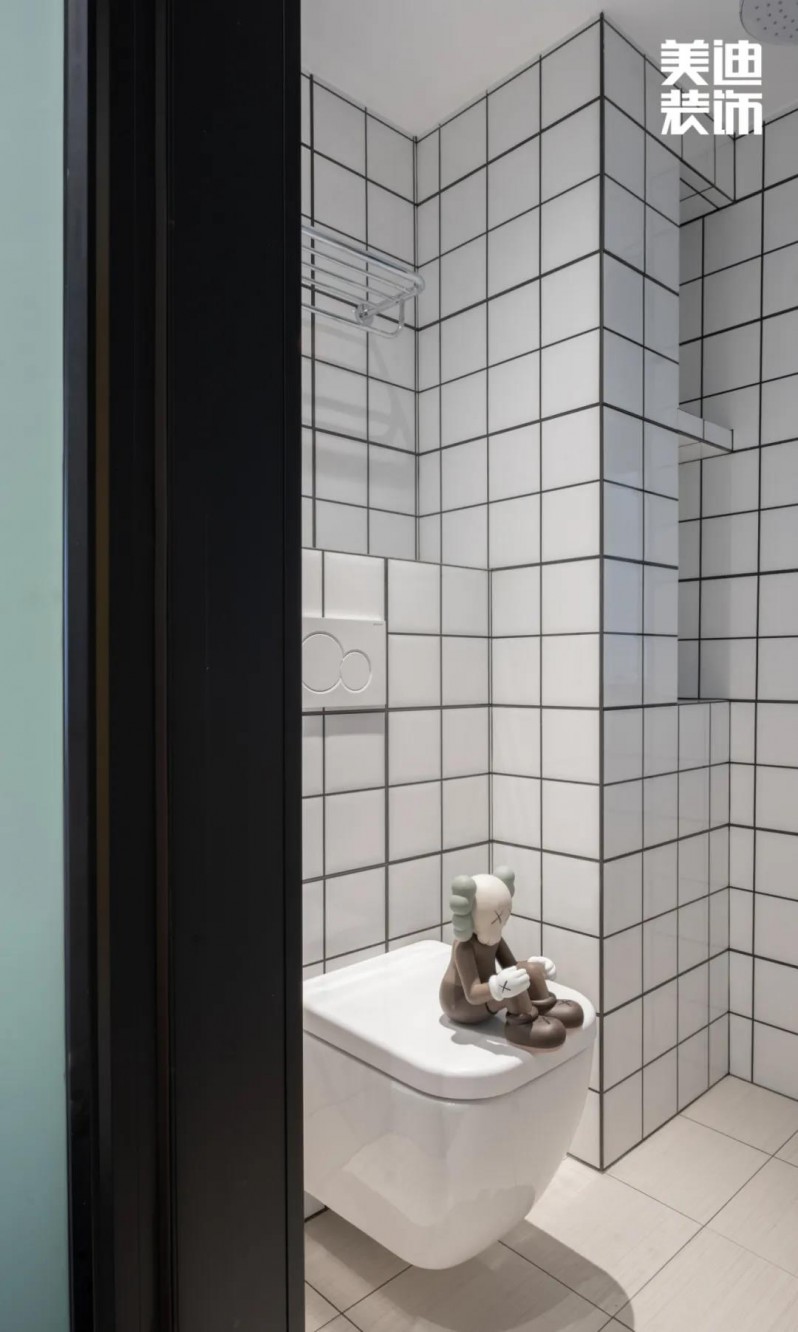 兩個(gè)衛(wèi)生間采用干濕分區(qū)的設(shè)計(jì),公衛(wèi)的洗漱盆放在外面,巖板與木飾面相結(jié)合的浴室柜,時(shí)尚又舒適的視覺(jué)感受。白色地磚搭配白色小方墻磚,簡(jiǎn)潔不單調(diào),高級(jí)富有質(zhì)感。