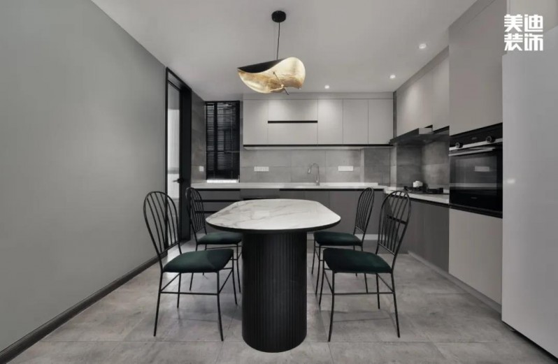 開(kāi)放式廚房,邊烹飪邊和家人高談闊論,促進(jìn)交流、加強(qiáng)感情。L型櫥柜設(shè)計(jì),空間利用率最大化。石英石臺(tái)面,簡(jiǎn)單大氣,不失格調(diào)。一部分為西廚,盡顯生活浪漫情調(diào)。
