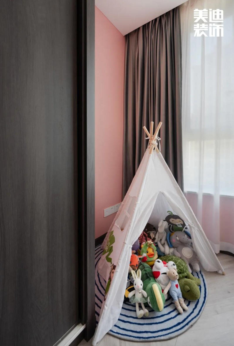 兒童房使用莫蘭迪紅色墻漆,清新可愛(ài)。窗戶角落搭了個(gè)小帳篷,童趣十足。軟萌的動(dòng)物玩偶,可愛(ài)又招人喜歡,讓整個(gè)房間充滿童真趣味。