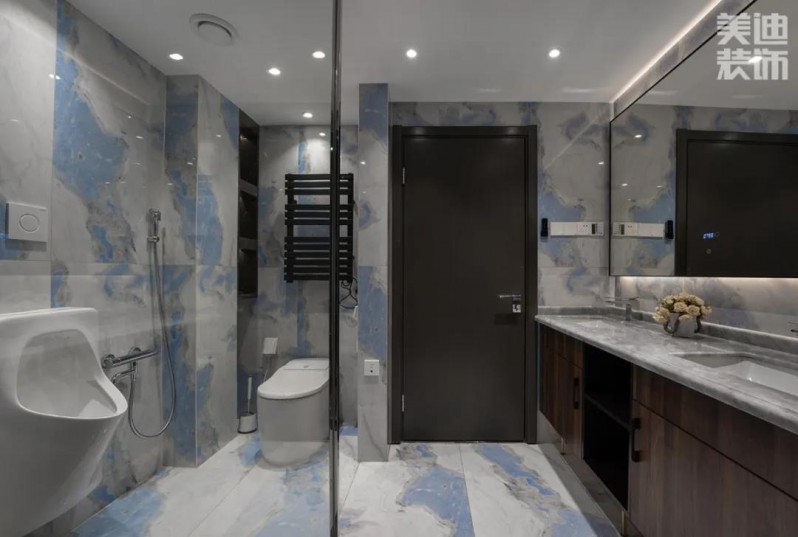 其次,浴室的功能屬性不可忽視,切記做好干濕分離。依照個(gè)人生活習(xí)慣,合理布局洗漱、淋浴和如廁三大區(qū)域。特色紋理的四季綠洲背景墻作為展示功能分區(qū)的視覺標(biāo)簽,助力打造層次分明的舒適空間。