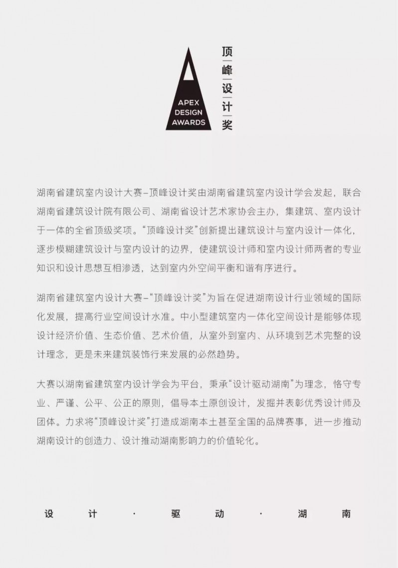 湖南省室內(nèi)設(shè)計(jì)大賽-頂峰設(shè)計(jì)獎(jiǎng)是由HIID湖南省建筑室內(nèi)設(shè)計(jì)學(xué)會(huì)發(fā)起,湖南省建筑設(shè)計(jì)院集團(tuán)有限公司、湖南省設(shè)計(jì)藝術(shù)家協(xié)會(huì)聯(lián)合主辦的,集建筑、室內(nèi)設(shè)計(jì)為一體的全省頂級(jí)獎(jiǎng)項(xiàng),目前已成功舉辦四屆。
