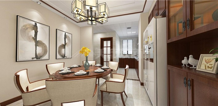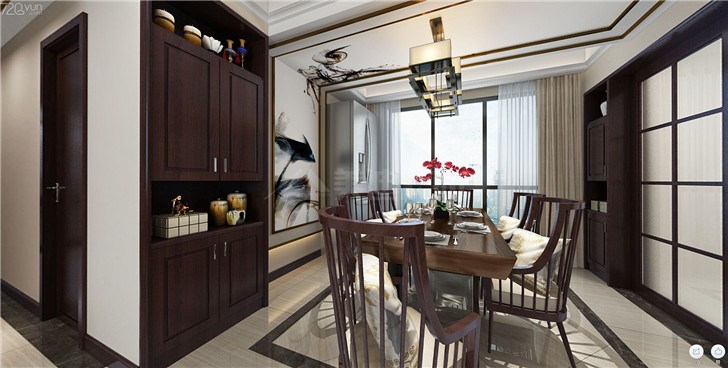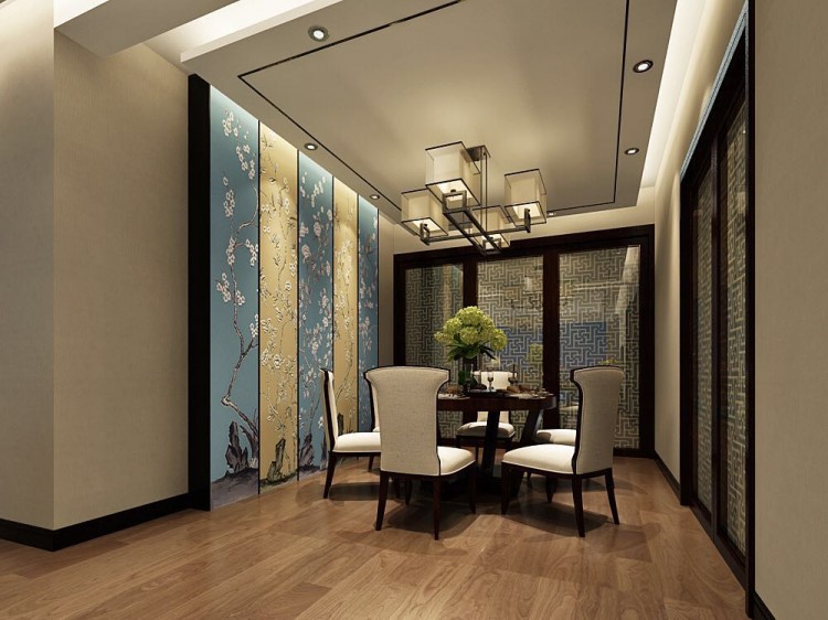 用鏤空式屏風(fēng)做玄關(guān)隔斷,不僅可以提亮空間,延展空間視覺效果,增加空間的通風(fēng)性,而且在屏風(fēng)上還可以放置東西,增加空間的收納功能。整個(gè)餐廳顯得和諧寧靜。