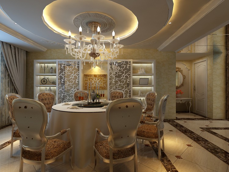 土黃色碗狀吊燈十分搶眼,與圓形餐桌相搭配,是空間的一大亮點(diǎn)。