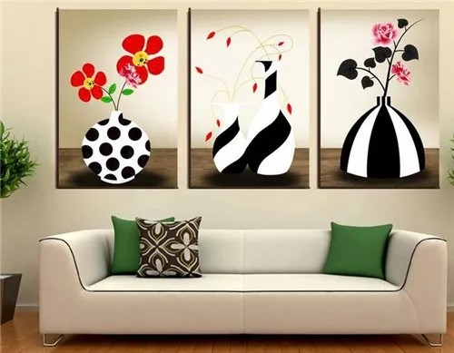 如果您不想采用太過(guò)復(fù)雜的裝飾畫(huà),不妨來(lái)一點(diǎn)小清新的,客廳背景墻上懸掛三幅以花瓶、鮮花為主題的裝飾畫(huà),配上白色簡(jiǎn)約款的沙發(fā),將客廳裝扮的格外的清新、淡雅,別有一番滋味。