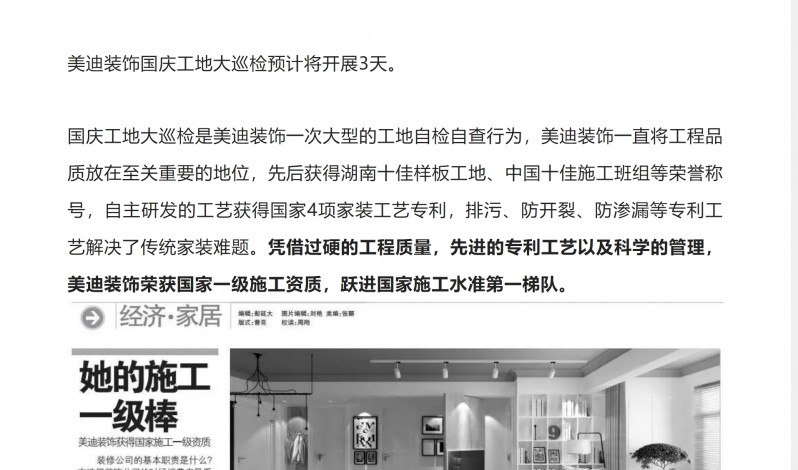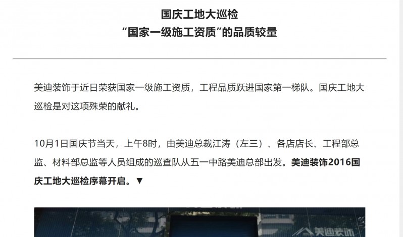 美迪裝飾于近日榮獲國家一級施工資質(zhì),工程品質(zhì)躍進(jìn)國家第一梯隊。國慶工地大巡檢是對這項殊榮的獻(xiàn)禮。