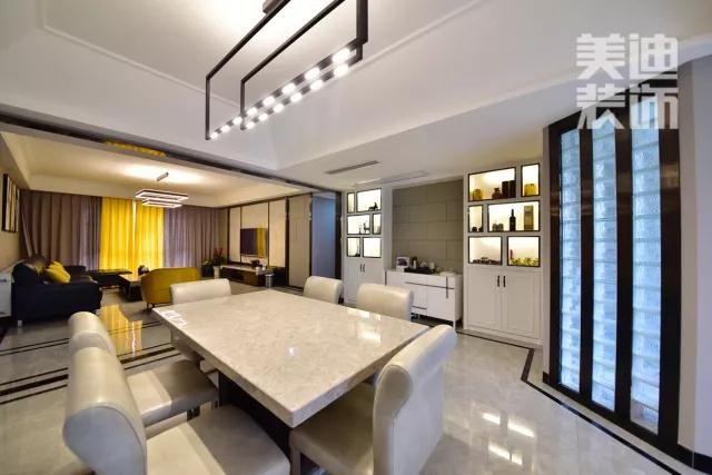 這個(gè)空間設(shè)計(jì)是業(yè)主要求的存在,設(shè)計(jì)師便打造了一個(gè)客廳、餐廳、吧臺(tái)三位一體的空間,吧臺(tái)旁邊是柜子跟微波爐,在適當(dāng)休閑中,一點(diǎn)紅酒配上加熱的食物,浪漫的感受生活中的小情調(diào)。