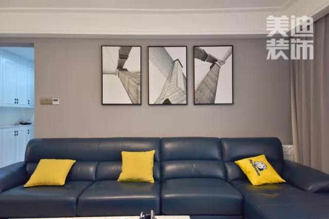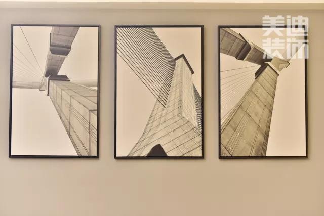 客廳沙發(fā)上的壁畫也是設(shè)計(jì)師為業(yè)主精心挑選的,建筑的灰白調(diào),以及層次分明的線條感,極大程度上提升了整個(gè)空間的格調(diào)。