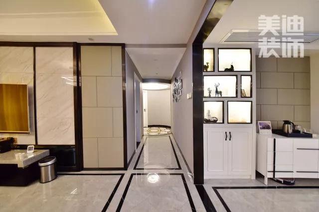 過(guò)道盡頭圓形上方的設(shè)計(jì)顯得特別,在現(xiàn)代風(fēng)格里夾雜了一點(diǎn)古代歐洲的韻味。右邊是記錄著一家人點(diǎn)滴回憶的照片墻,正對(duì)著一個(gè)房間的門口。