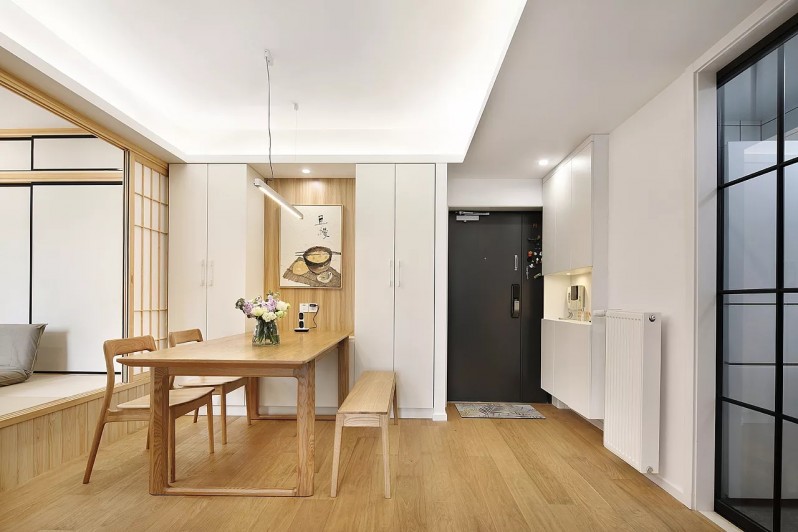 溫潤(rùn)的木色與簡(jiǎn)單的白色相搭配,營(yíng)造出舒適的居家環(huán)境。玄關(guān)處裝修非常簡(jiǎn)潔,沒有做任何設(shè)計(jì),空間上一覽無余。