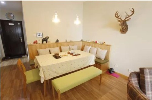 因?yàn)樾粜涂臻g限制,所以餐廳和客廳是一體化設(shè)計(jì),不僅提高了空間的利用率,同時(shí)也讓空間看上去比較通透寬敞,讓人感覺非常緊湊自然,非常精美溫馨??ㄗ竺媾_(tái)子上擺放著各種各樣的玩具擺件,搭配上餐廳背景墻上的鹿頭掛件,讓整間餐廳充滿情調(diào)。