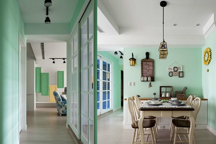 餐廳以嫩綠色為主,墻面的裝飾也配合了美式風格,壁燈和吊燈的設計也互相輝映,整體效果看上去更凸顯了風格特色。