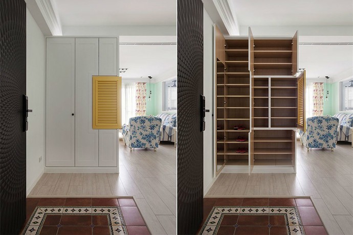 玄關的設計滿足了小戶型的需求,又足夠大的空間收納,在整個白色空間下加入黃色的點綴,設計生動了不少。