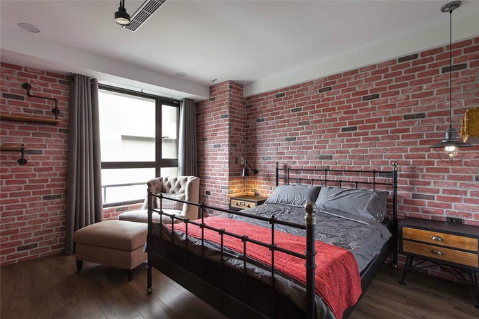 主臥的設計和整體房間色調不同,主要偏工業(yè)美式風,復古的家具和鐵藝床,個性但不夸張,非常符合年輕人的審美。