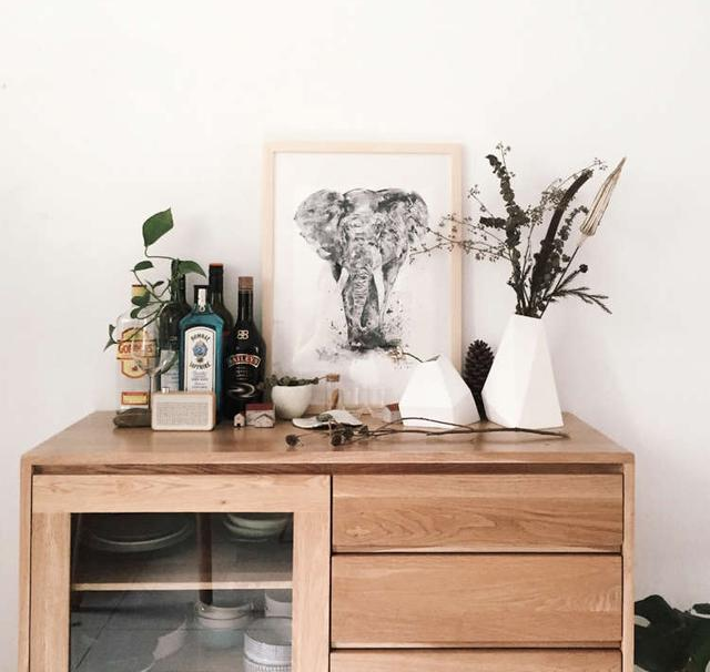 用裝飾畫、小盆栽來(lái)裝飾餐邊柜的臺(tái)面。