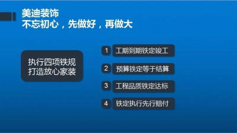 水電維系著整個家庭日常生活的運轉(zhuǎn)。水電沒裝好,輕則電路短路、跳匝,重則水管爆裂拆了要重新裝。如果您完全沒時間全程監(jiān)控裝修質(zhì)量和進(jìn)度,那選擇一個嚴(yán)格保證質(zhì)量與施工品質(zhì)的公司至關(guān)重要。美迪裝飾,放心家裝,四項鐵規(guī)(期到期鐵定竣工、預(yù)算鐵定等于結(jié)算、工程品質(zhì)鐵定達(dá)標(biāo)、鐵定執(zhí)行先行賠付),我們一直都在做放心家裝這件事,把消費者對家裝的‘擔(dān)心’變成‘放心’。