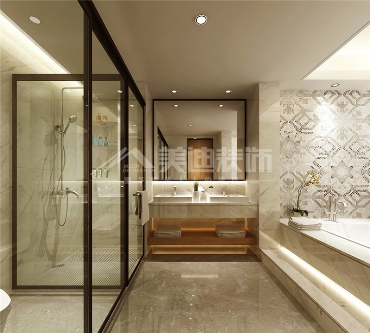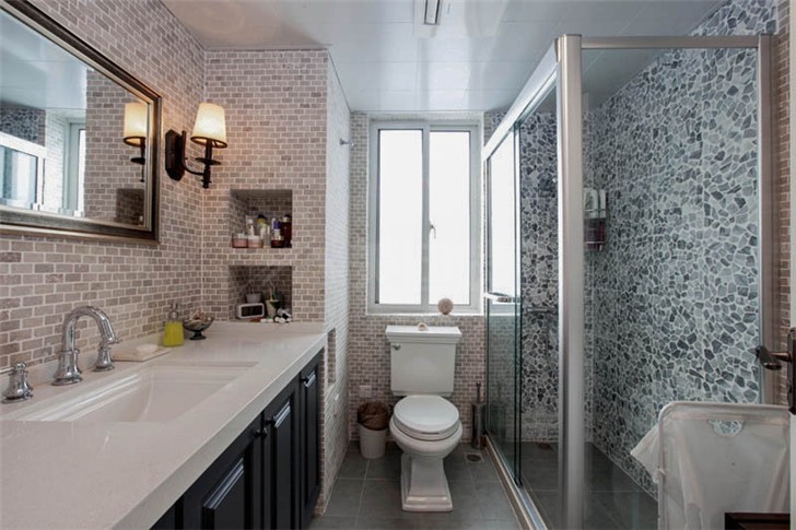 墻面是占據(jù)整個空間大部分面積,而整體色彩會給人先入為主的既視感,因此,提升的關(guān)鍵要從墻面開始,在顏色上,宜選用清冷淡雅色調(diào),除給人以干凈清爽之感外,也會增加空間感,如不規(guī)則條紋大理石,讓整個衛(wèi)生間充滿隨性,輕松