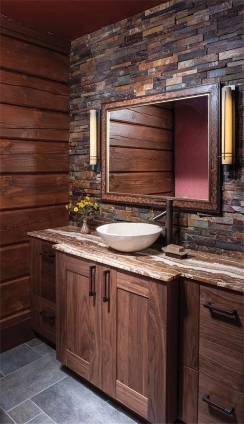 木質(zhì)結(jié)構(gòu)的臺(tái)盆柜和周?chē)b飾環(huán)境相映襯,整個(gè)空間看來(lái)穩(wěn)重很多。白色的小臺(tái)盆是整個(gè)空間中的點(diǎn)睛之筆。