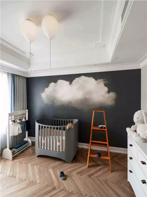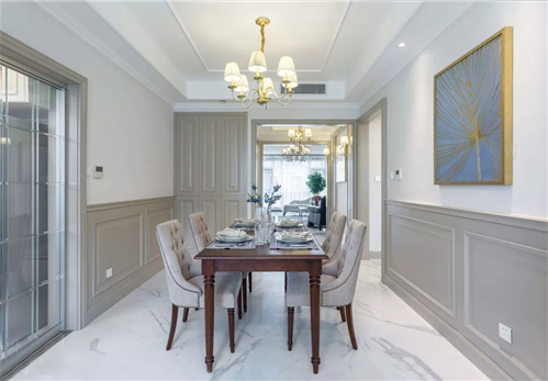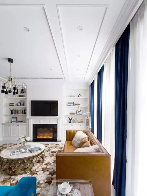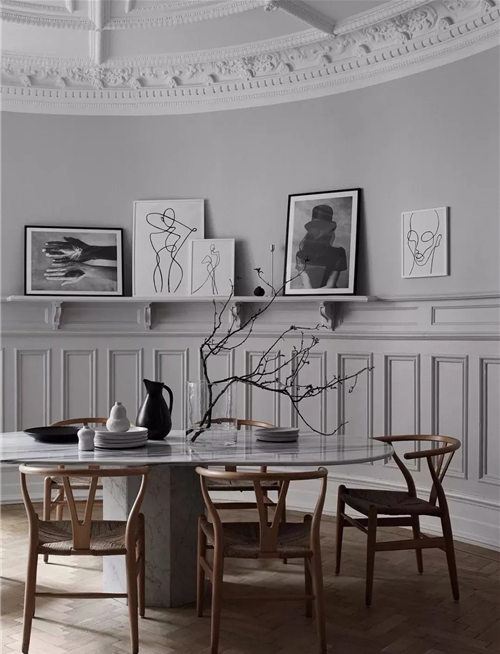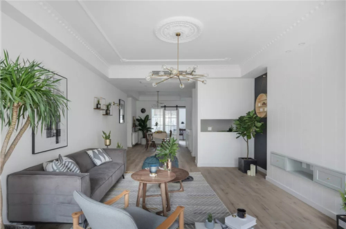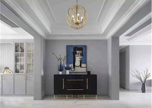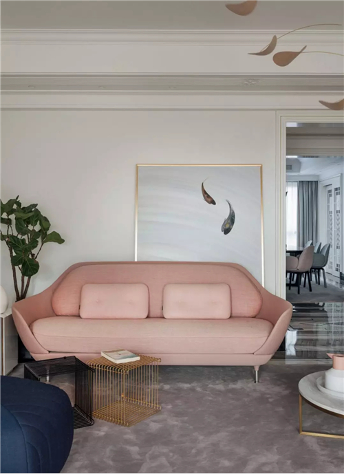 白色的石膏線在天花勾勒造型,其實(shí)很有藝術(shù)感。在硬裝時(shí)選用了花紋比較復(fù)雜精致的石膏線,那么軟裝上搭配簡(jiǎn)練、線條流暢的現(xiàn)代家具,對(duì)比之下,就更有時(shí)髦感了。