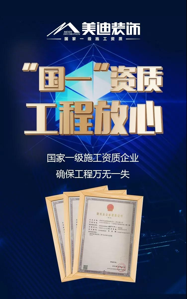 美迪裝飾工程品質(zhì)得到了國家住建部的認(rèn)可,2016年被授予國家一級(jí)施工資質(zhì),它是家裝工程的最高榮譽(yù),擁有該資質(zhì)的家裝企業(yè)僅為千分之一。
