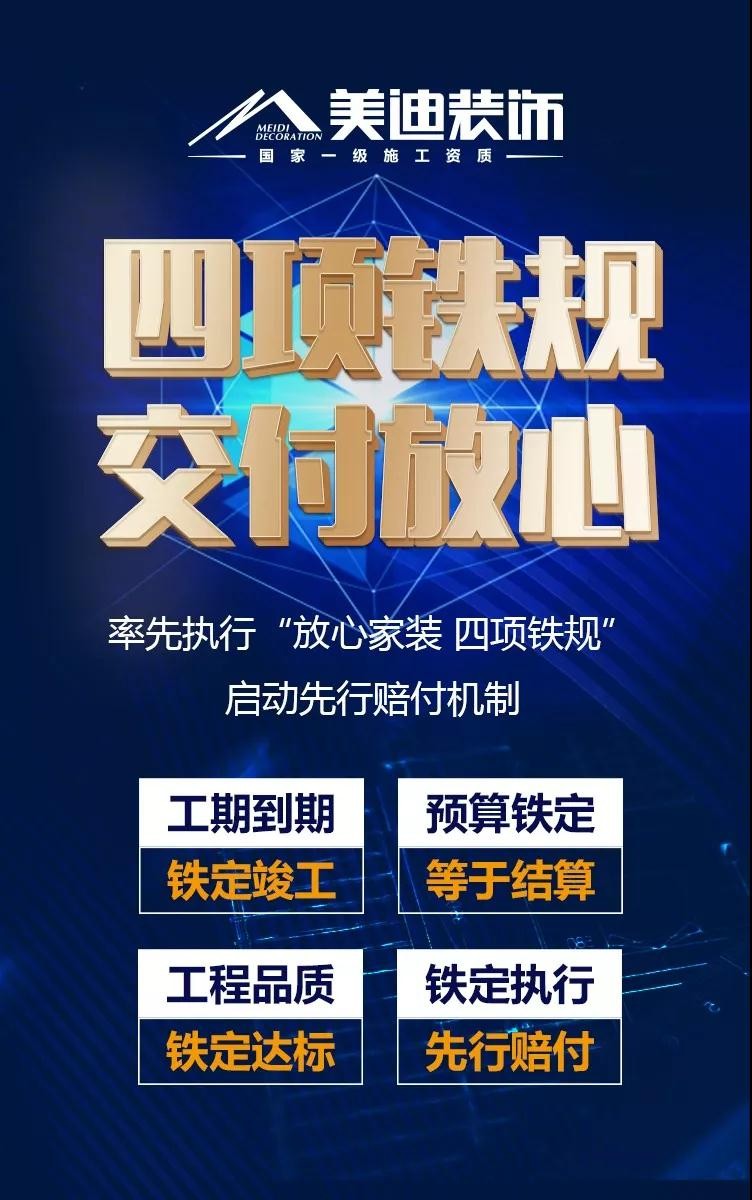 美迪裝飾作為誠信家裝企業(yè),向廣大消費(fèi)者鄭重承諾,鐵定執(zhí)行“放心家裝”四項(xiàng)鐵軌:工程到期鐵定竣工、預(yù)算鐵定等于結(jié)算、工程品質(zhì)鐵定達(dá)標(biāo)、鐵定執(zhí)行先行賠付,為消費(fèi)者打造高品質(zhì)放心家裝。