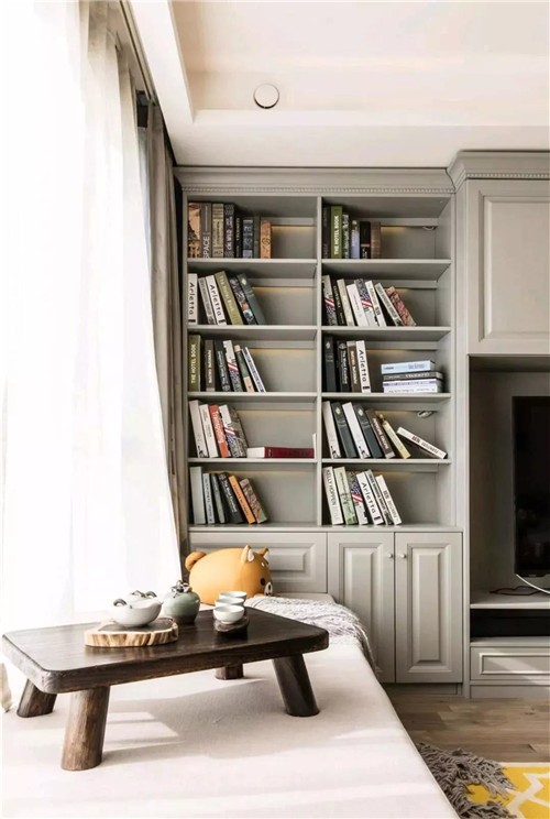 電視墻集合了收納、電視、書架等功能在一體,中間位置騰空出電視位置,上方下方都是收納柜,而兩側則裝著大面積的書架,擺滿了主人愛看的一些書籍;