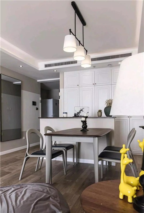 餐廳布置一套獨特極簡造型的硬塑餐桌椅,搭配一盞黑色鐵藝架的三拼吊燈,整體顯得現(xiàn)代簡潔又優(yōu)雅大方;