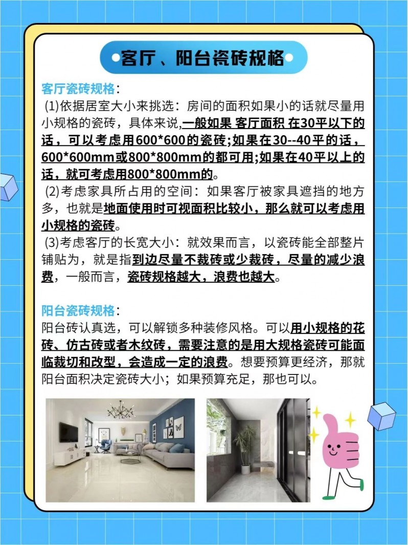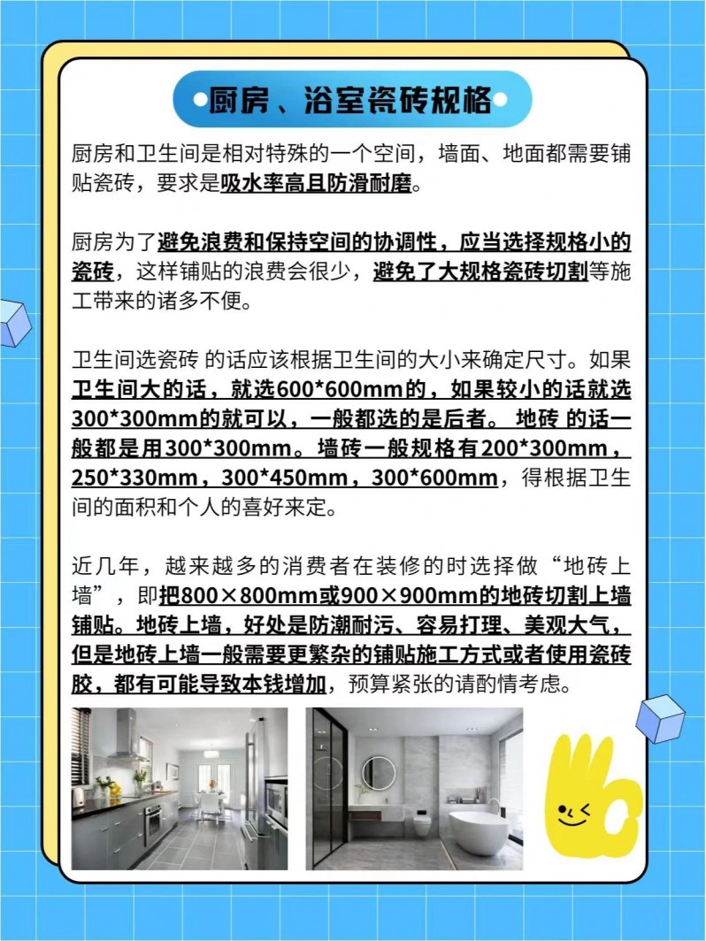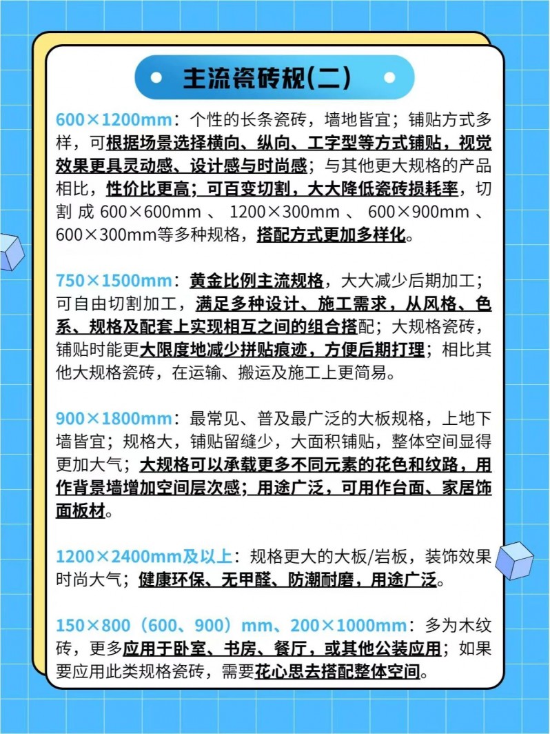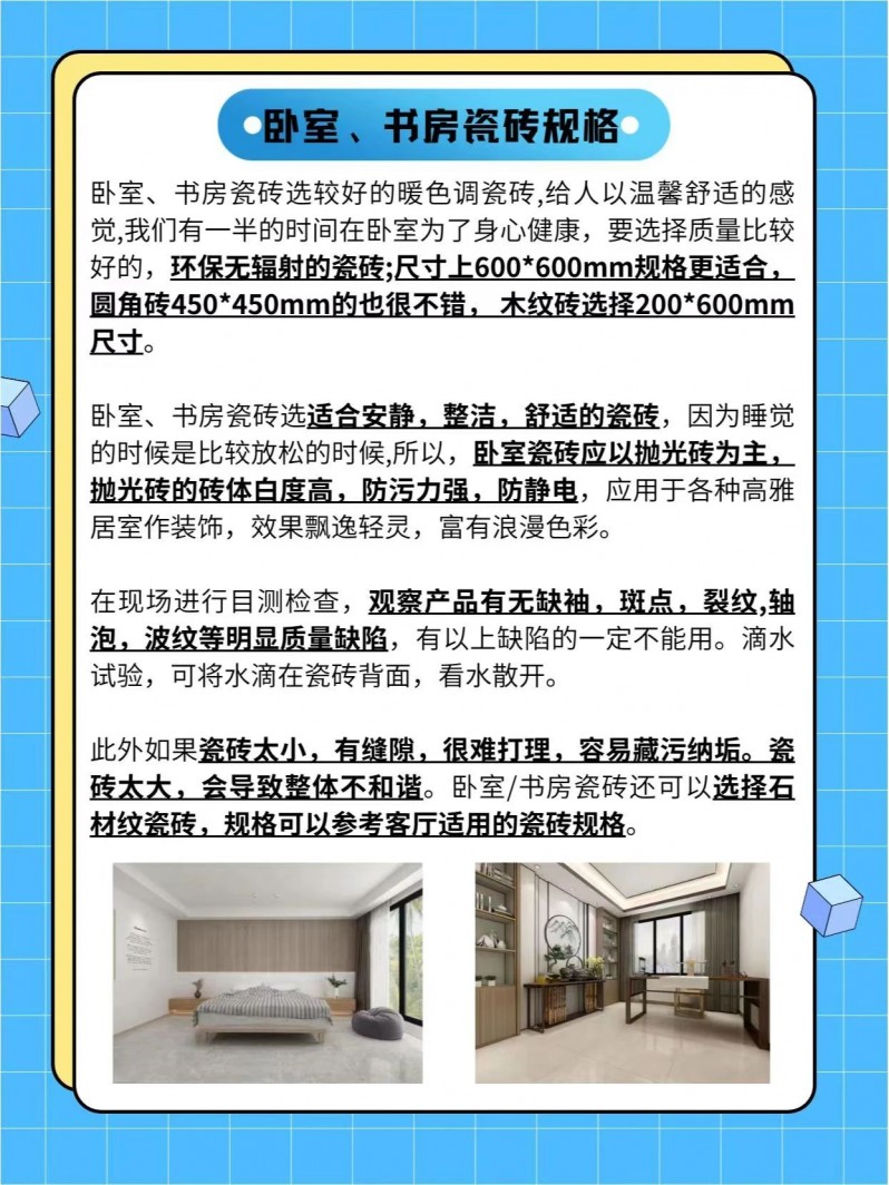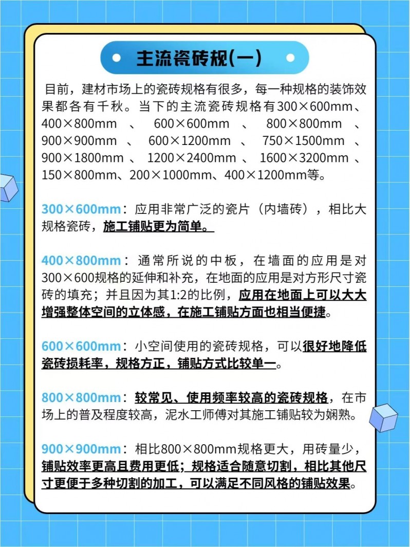 (4)瓷磚規(guī)格太大或太小可能會(huì)導(dǎo)致鋪貼施工本錢以及運(yùn)輸搬運(yùn)本錢增加。