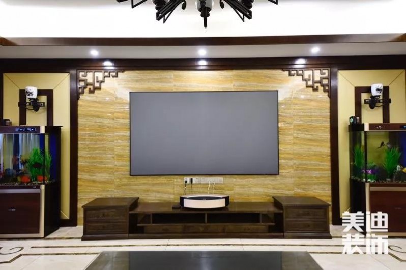 客廳采用大塊面的黑白灰對比,展現(xiàn)簡單的美好。大理石的電視背景墻與兩側(cè)的魚缸交相呼應(yīng),不多余也不單調(diào)。