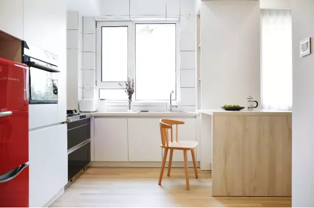 整體櫥柜與純白的整體空間融為一體,簡約而有品位,紅色冰箱采用了內嵌式設計,為視覺帶來強大的沖擊力。