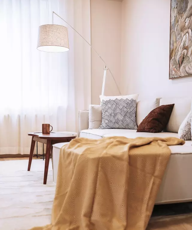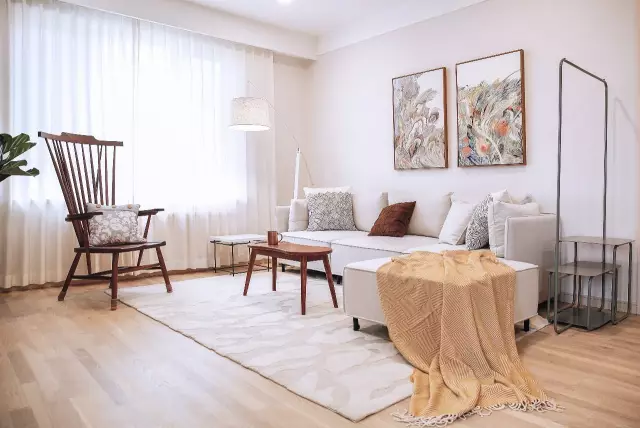 幾何圖案的抱枕,隨意擺放的毛毯以及富有藝術感的裝飾畫,共同打破了純白沙發(fā)帶來的單調,既活躍了空間色彩,又呈現出了北歐風特有的隨意自然。