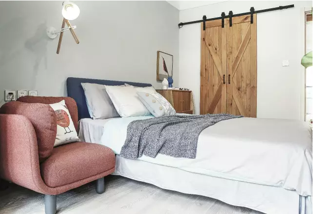 谷倉門里面藏了一個嵌入式衣柜,足以滿足業(yè)主強大的收納需求,門一關上也不會影響臥室的視覺感,反而讓這扇門成了一件不錯的裝飾。